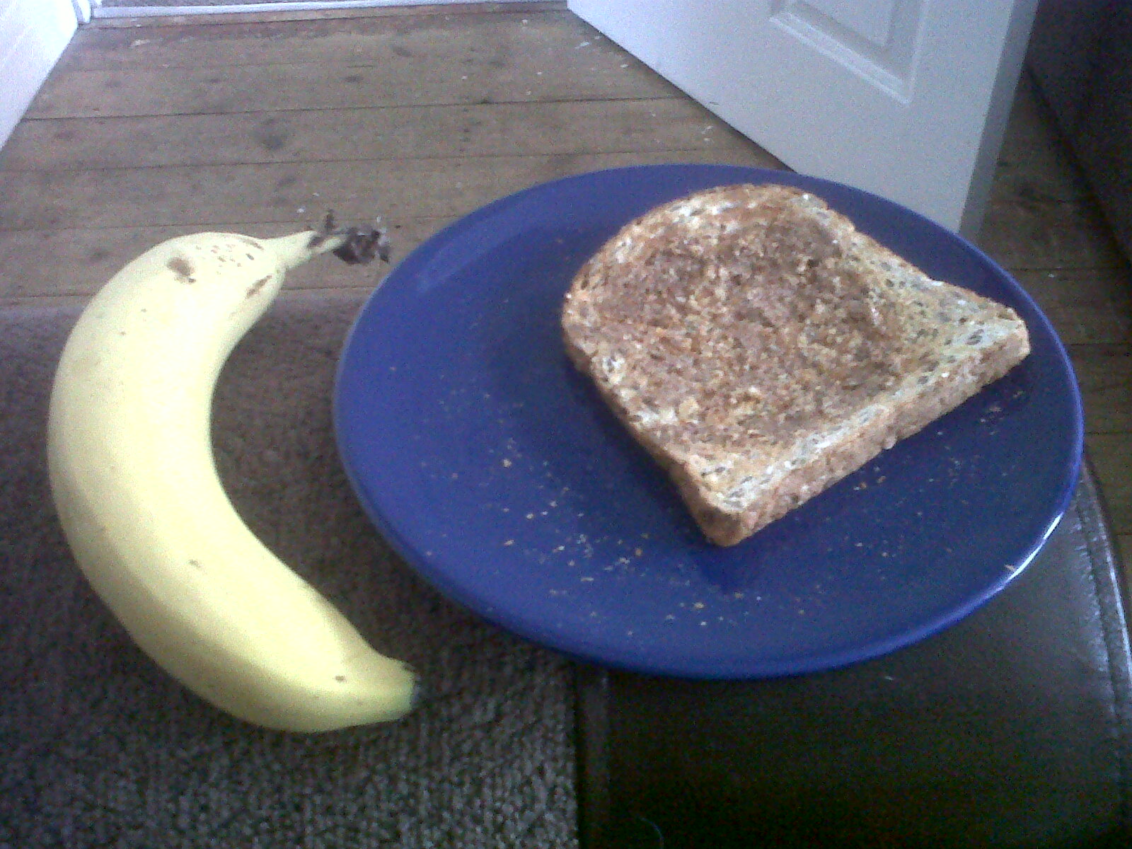 Breakfast was a banana and slice of soya and linseed bread with almond butter. Had no milk this morning so couldn't have oatmeal!!! :-(