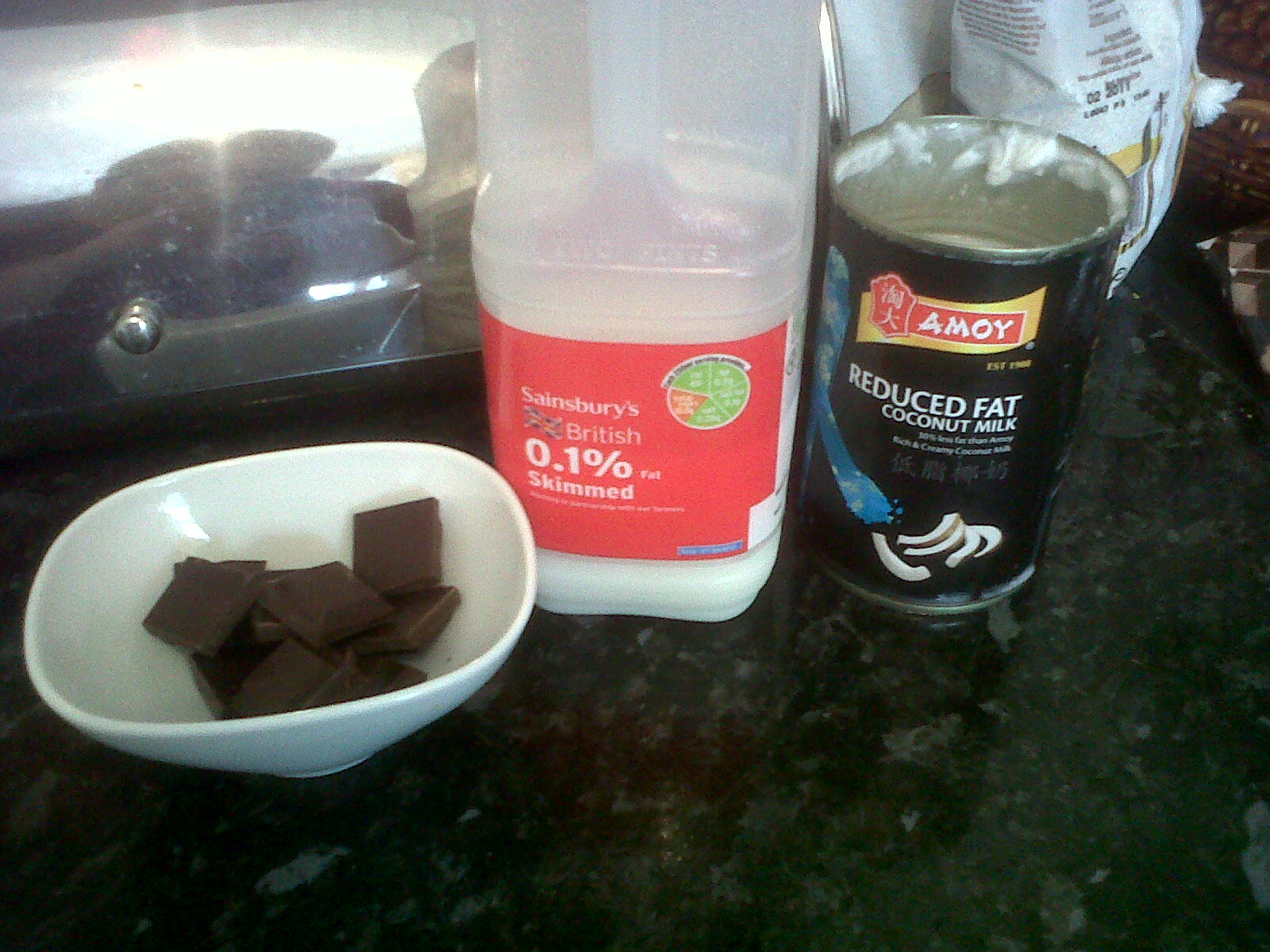 Put the milk and coconut milk into a pan and bring to boil. Then add the chocolate, turn off heat and continue to stir until the chocolate has melted. Then enjoy :-) Pure heaven.